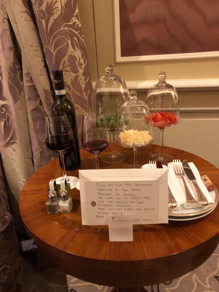 The Italian flag in olives, cheese and tomatoes — with wine and taralli. Followed by an evening gift of Lavender and Camomile spray for the pillows of our luxurious bed.