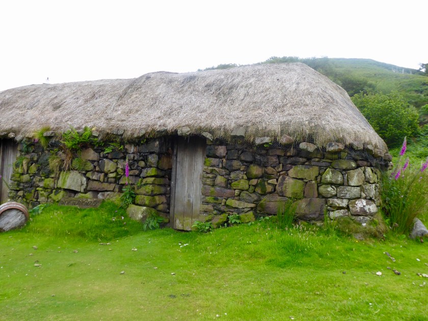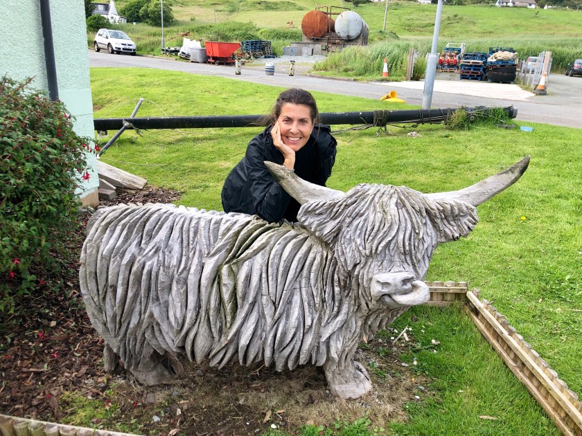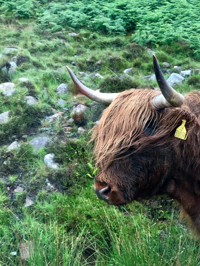 Did I mention the Highland cattle? We ran into a few on the road, and they seem to be the mascot of Skye. Steve’s son has a pottery shop that specializes in these beasts and we’ve brought a few home (in the form of mugs)
