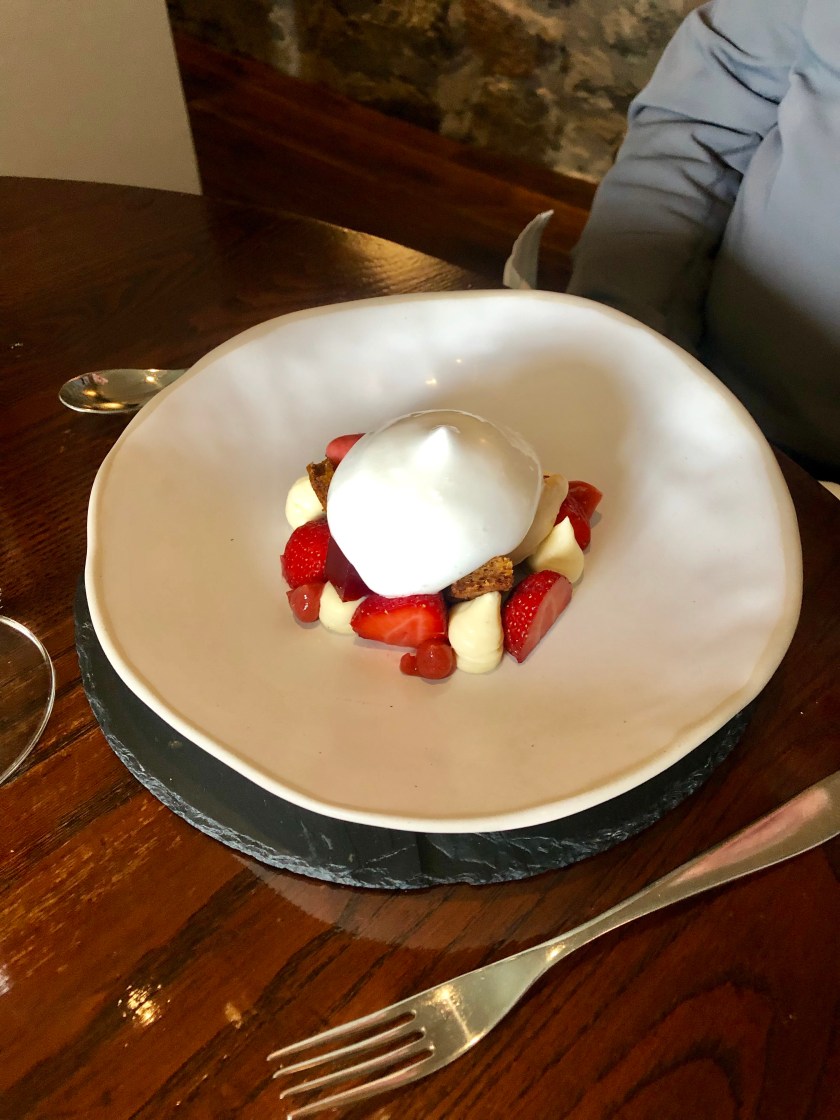 We started with complimentary fried herring bits with the most perfect rouille I have ever tasted. It was a fantastic combination. We migrated to duck confit, saffron panisse, then onto Scottish beef and fresh hake, followed by hazelnut dacquoisse and the most unbelievable strawberry sorbet with champagne jelly.