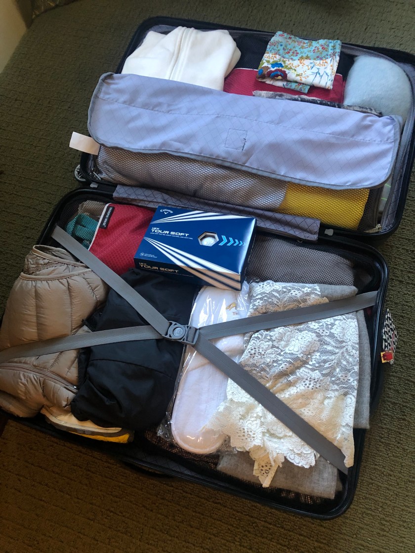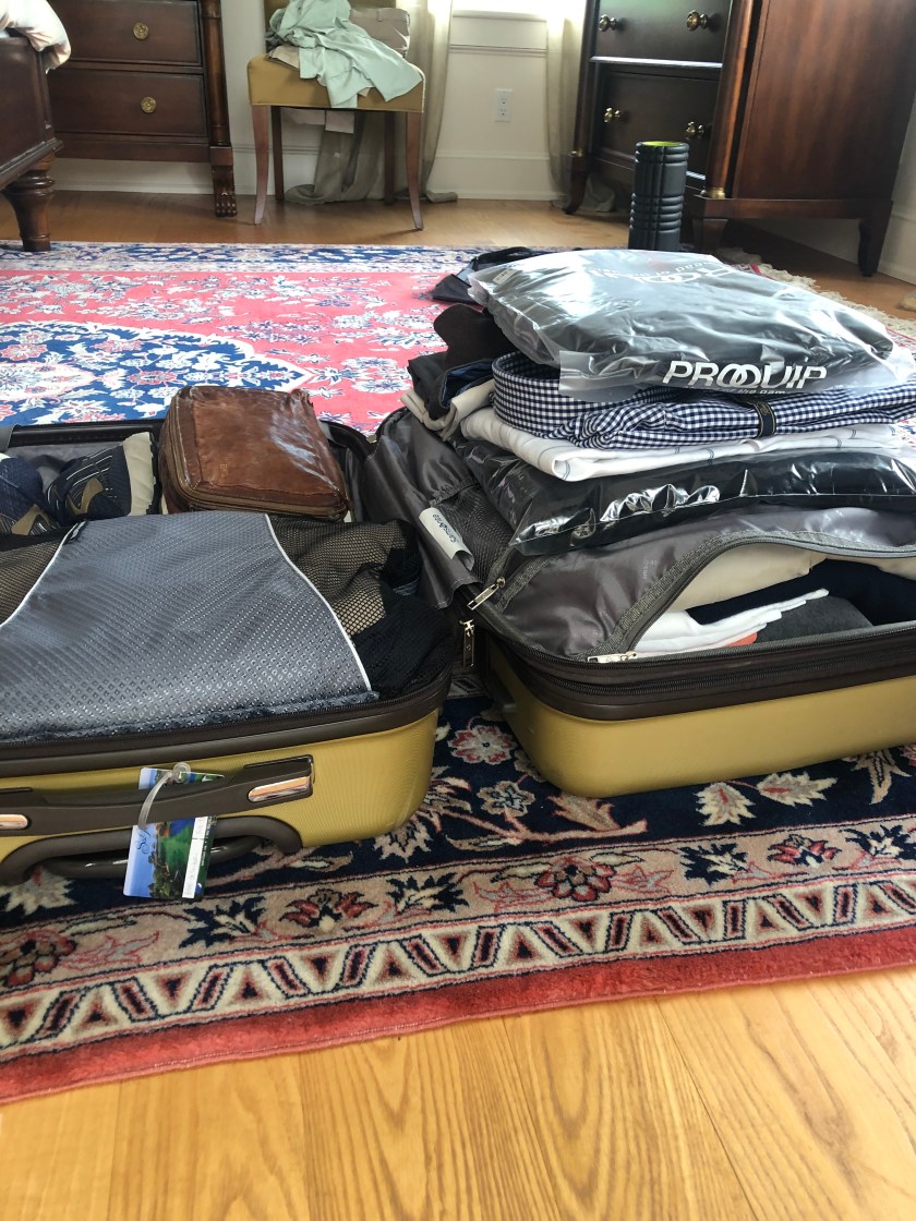 Packing is always a challenge. We are headed to the Highlands where it will be 50 degrees and pelting rain, and Ayrshire where it should be 65 and mostly sunny. We are hiking, golfing, skeet shooting, visiting dead ancestors and eating in our fair share of Michelin starred restaurants and local pubs. 14 days of adventures.My bag, first one above, weighed in at 36 lbs. Brad’s needed a bit of help. We did some editing and managed to get it to 42 lbs. Checked in and ready to go!