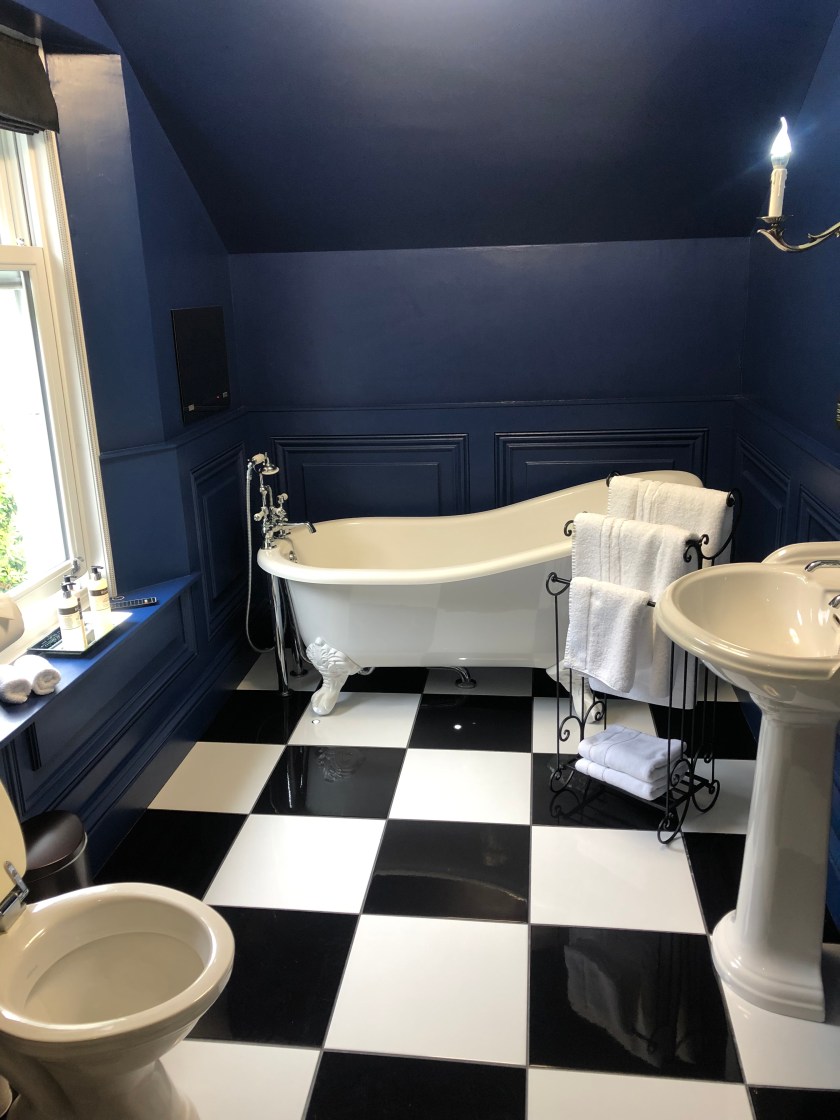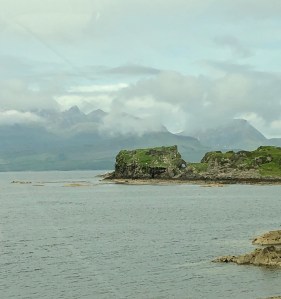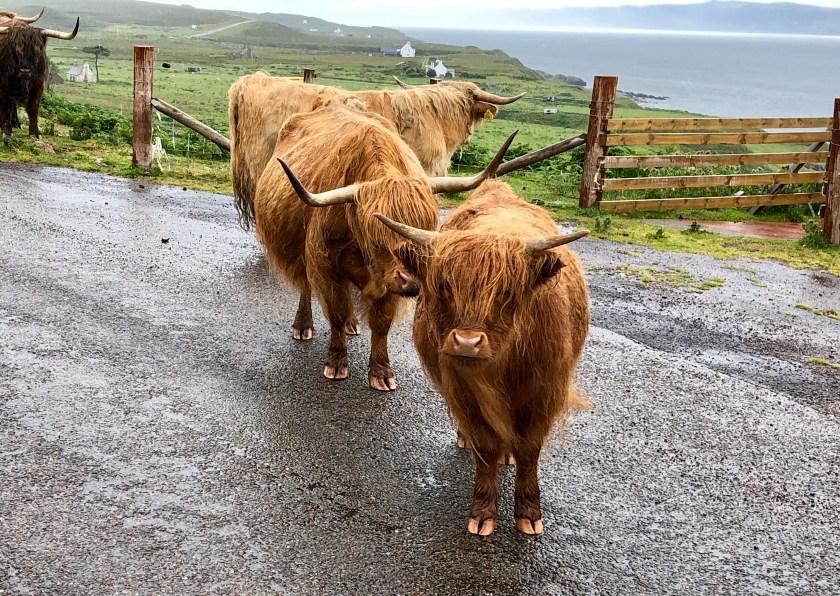 Our new driver, Steve, a former police captain, picked us up and regaled us with stories, history and verdant vistas. We stopped at a little restaurant that specializes in hot smoked Scottish salmon (all ocean farm raised, by the way) and I met my second Scottish cat who resides there. Mitzi is one smart feline. As we traversed the Applecross Road on our way to Skye, a heard of Scottish cattle stopped us for a bit. We made it to Kinloch Lodge, home of Lord and Lady MacDonald. The Lodge has seen better days, but is still a lovely Inn if you like patina. The dining is the real reason to stay in this lovely remote location. Five course fantastic meal with great wine and peaty water. It was a delightfully refined meal until a group of 12 loud Americans showed up. It always reminds me how loud and confident and bullish we are. I’m first on the list of this, but when we see ourselves compared to the British, we are garrulous and gross. I need to keep this in mind — speak in a whisper, be exceedingly polite, and realize you are the foreigner here. I’ll let you know how I do.
