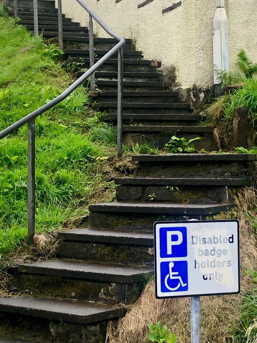 We started the day with Irish porridge laced with whiskey. A real kickstarter! After breakfast I took a brief walk around and found my first Scottish cat. Not particularly friendly, but neither is the Scottish version of the ADA. We both burst out laughing — handicapped parking right in front of two flights of stairs!