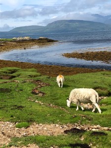 We woke up to a drizzly, foggy morning and took an early walk around Lady Claire’s estate (Kinloch Lodge). It was like living in a fairy tale. After a walk we had another wonderful bowl of porridge (no whisky, but nutmeg!). Our great driver/guide, Steve picked us up for a day of adventures and the skies cleared. We stopped at the Clan MacDonald estate, museum and gardens and were entranced by the history and grounds.Here is Brad and Steve in front of the castle ruins in Armadale. We headed off the tourist trail to a lovely rocky beach in Ord. Like a painting. We had a bit of lunch then headed through Portree (the main city on Skye) and over to a burial ground up island where the locals left for the Carolinas in the 1700’s.