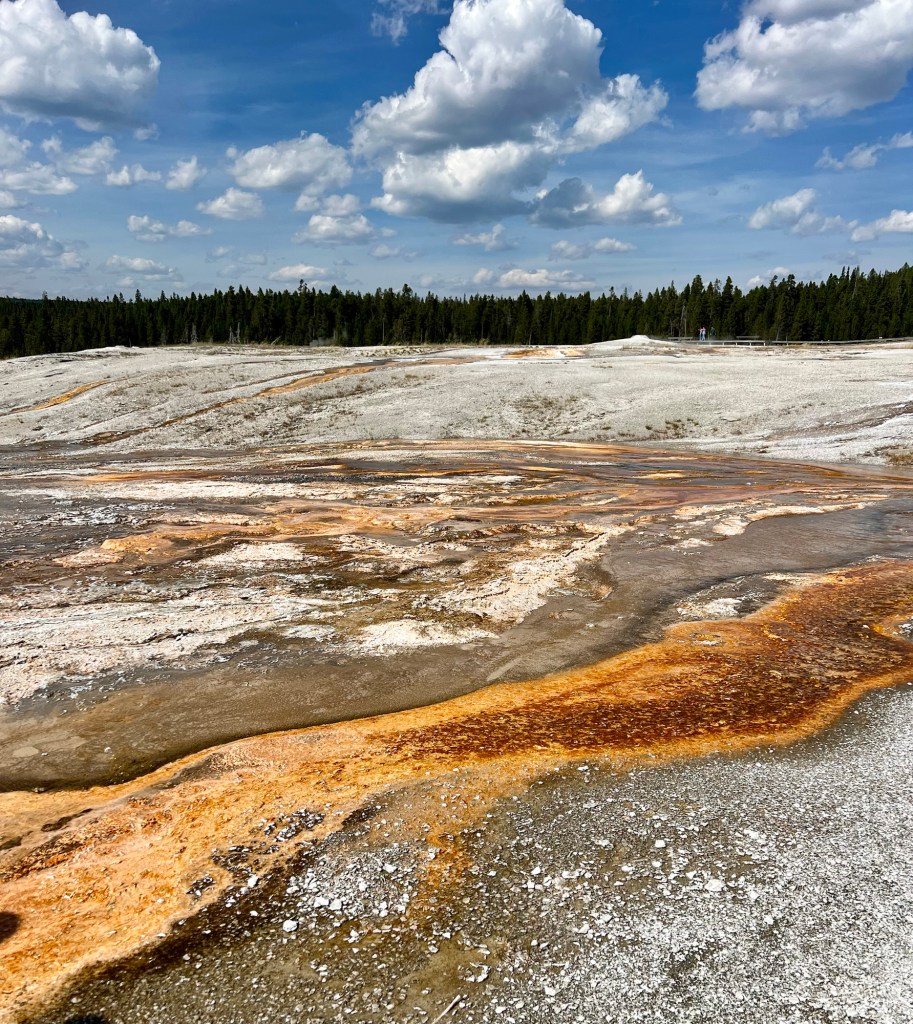 The landscape is lunar. You’re at almost 7000 feet and it feels like sea level. We are literally standing on a volcano that spits and boils all day and all night. The water in these crystal clear aqua blue pools is 180 degrees, and it’s boiling up and rolling down hillside leaving minerals and bacteria and killing everything in site. It looks like a barren wasteland with boiling pools that smell like sulphur. And then you go a mile down the road and it’s all pine trees and streams. It’s hard to wrap your head around it.