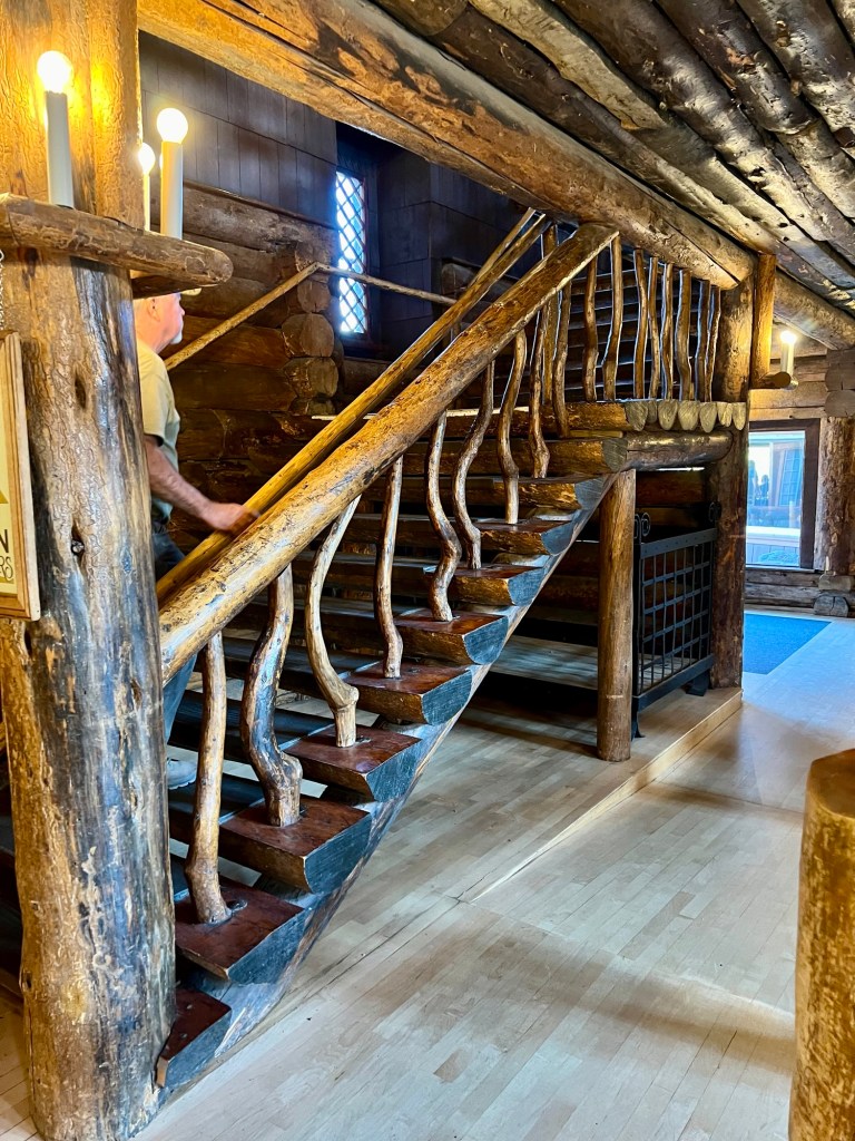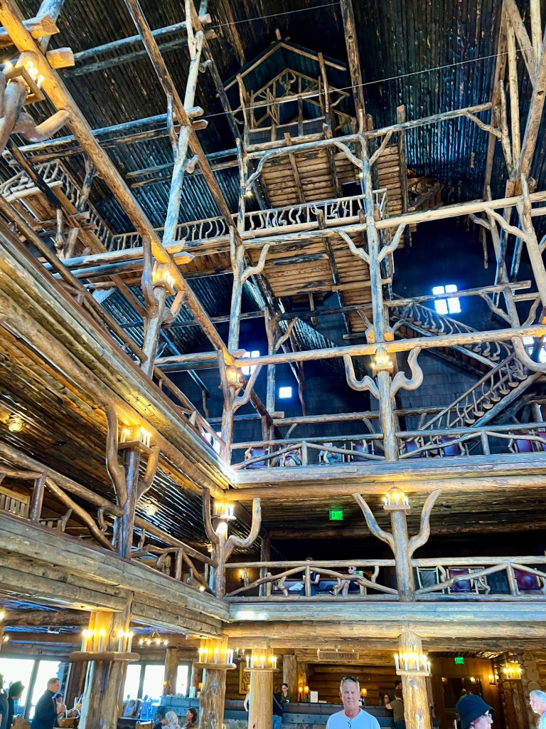 This hotel is the model by which all National Park buildings are designed. It is rustic, fanciful, and wonderfully restored and maintained. Tax dollars to be proud of. It is built with lodgepole pine from the area, and the architect had crews hunting for interesting twists and burls of wood that were incorporated into the design. The original blacksmith work is still being used for door handles and room numbers, and the lighting fixtures have been replaced, but to the exact initial design.