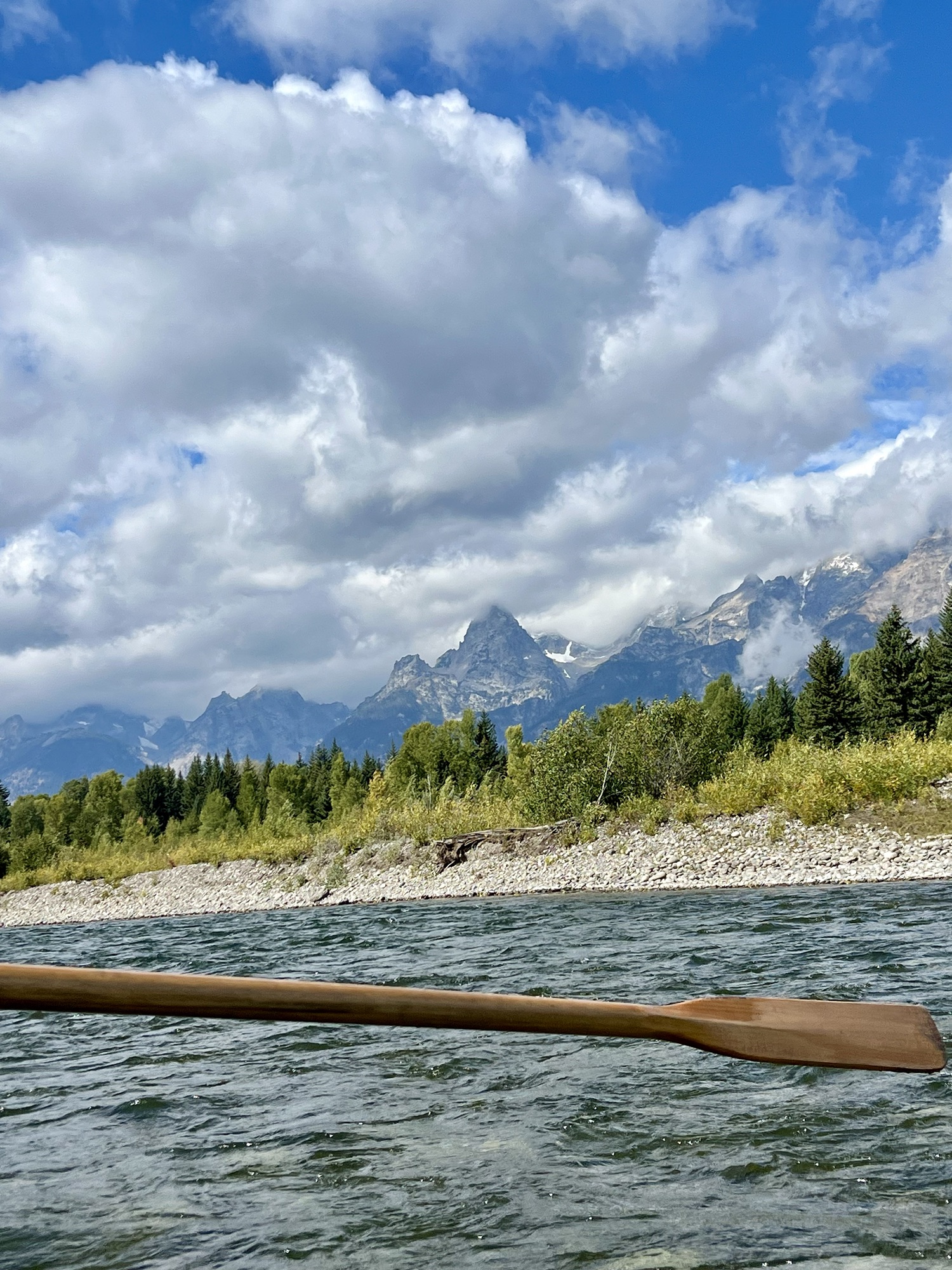 Sleep was delicious, so we skipped the early scouting trip and had coffee in bed. The rain abated, but overcast skies and a good wind required the hats and gloves and fleece and Gortex we’ve been dragging around. We headed to the Snake River for a “Float”.