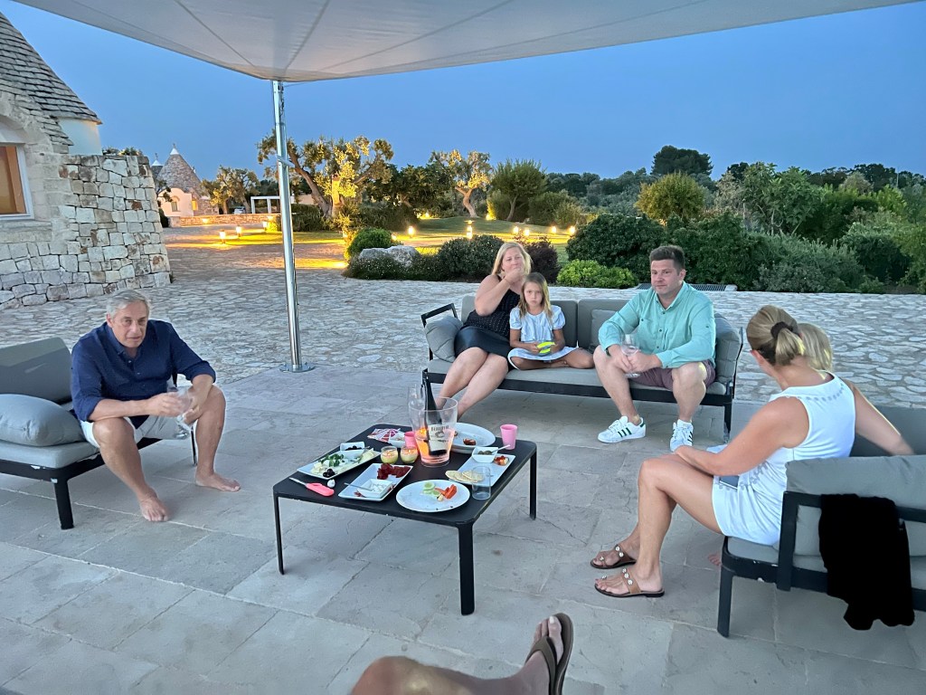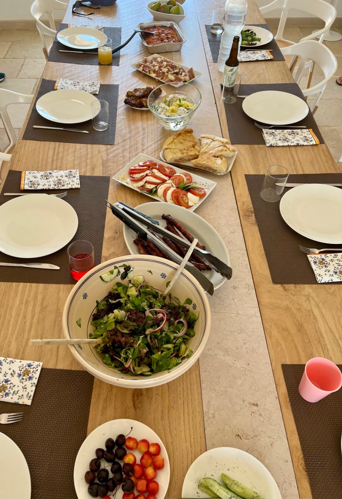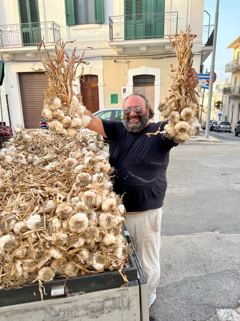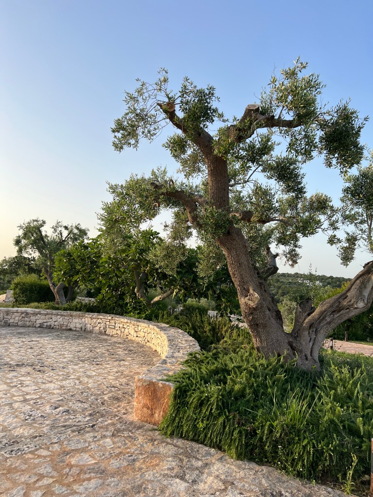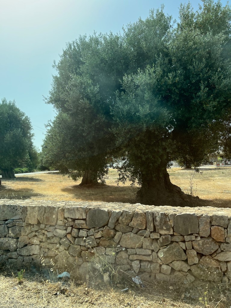 A bit about The Valle d’Itria, the area of Puglia that we are in. This valley is the largest olive growing region in Italy. The olive oil is smooth and creamy, the trees can be 600 years old, and they are ubiquitous. Every inch of ground is planted with something. At the gas station, the owner has the perimeter of the station planted with tomatoes, cucumber, herbs, onions, garlic, and zucchini. It reminds me of every Italian immigrant family I grew up with — everyone had a garden, not a yard. There is a reverence for the land, a love of the soil, and a gratefulness of the bounty. The people here care deeply about how the land is tilled and worked. It is almost all organic and there is pride in farming in the old ways. There is a twinkle in their eyes when they tell you to pick and eat because there is no spraying.