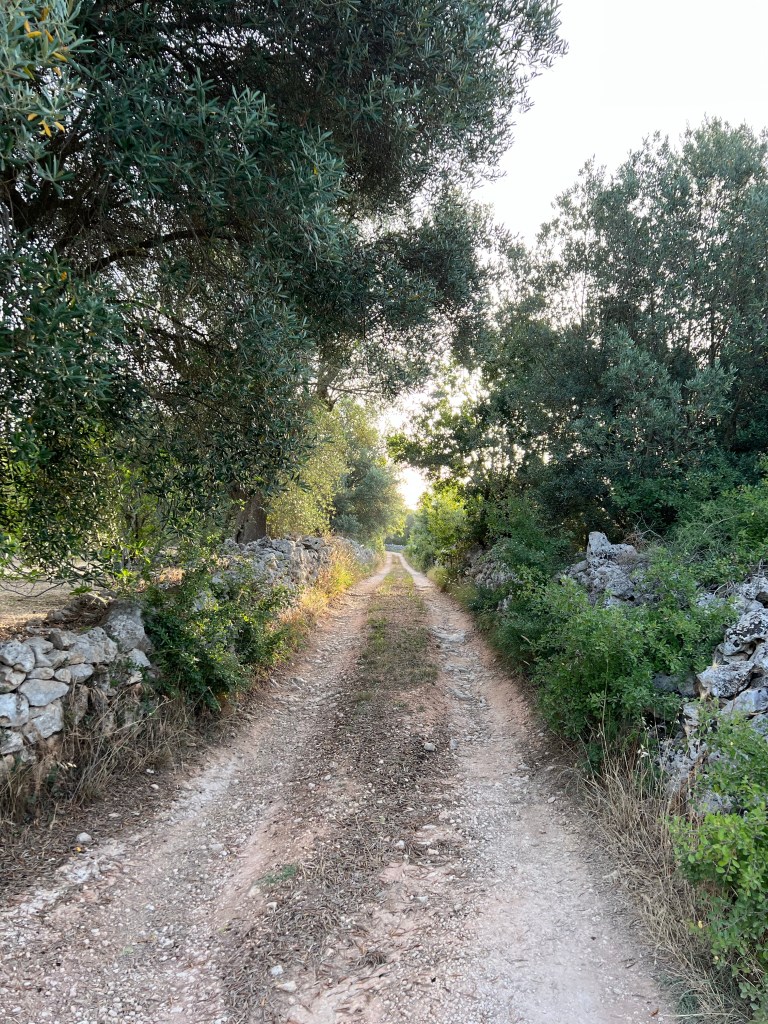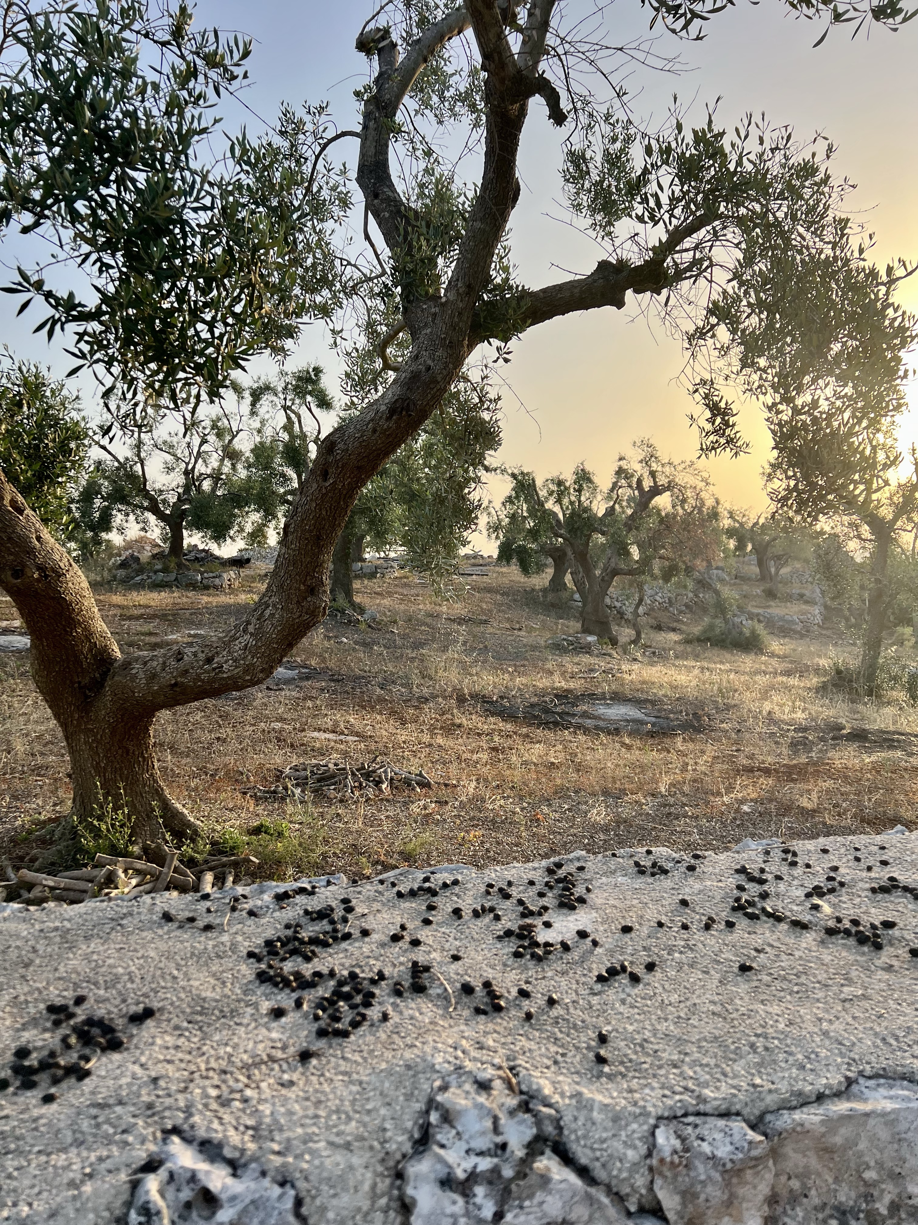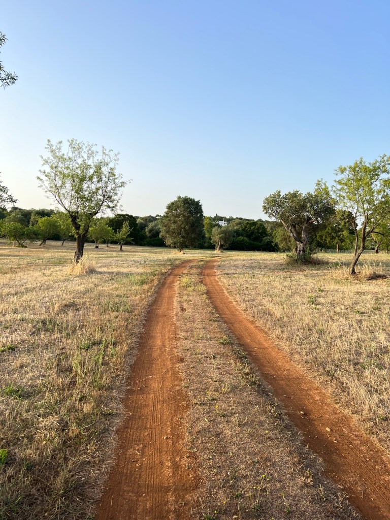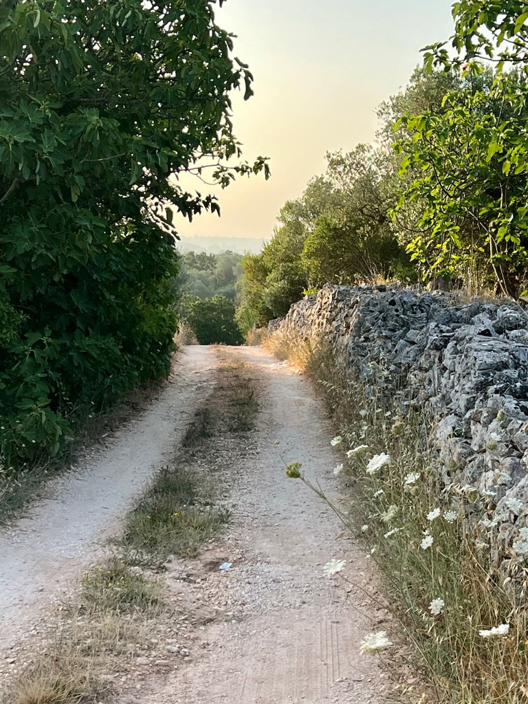 I woke up early again and went for a walk in the silent, still morning. It’s cool and quiet and there is no one but roosters and bees making any noise. The fields around the Villa seem so uninhabited, but as I walk through, there is a small Trulli here, and a little farm there, and a tiny vineyard someone must be tending. It is all so ancient and I keep wondering what it was like 100 years ago or 1000 years ago — probably not much different. I found dried olives on an very old stone wall under a tree, fig trees everywhere (we eat them every day), and desolate paths that all must lead to somewhere. It is enchanting.