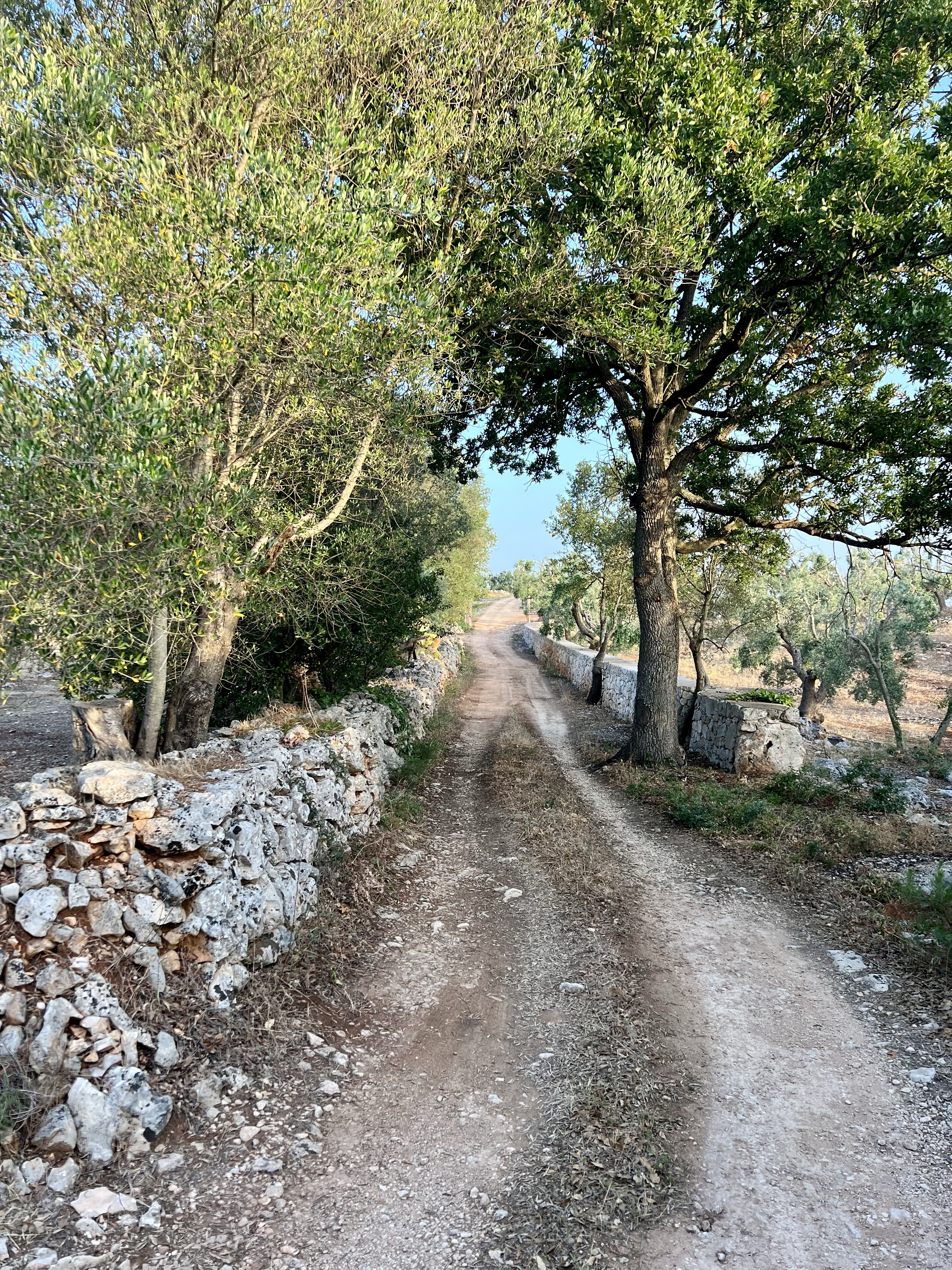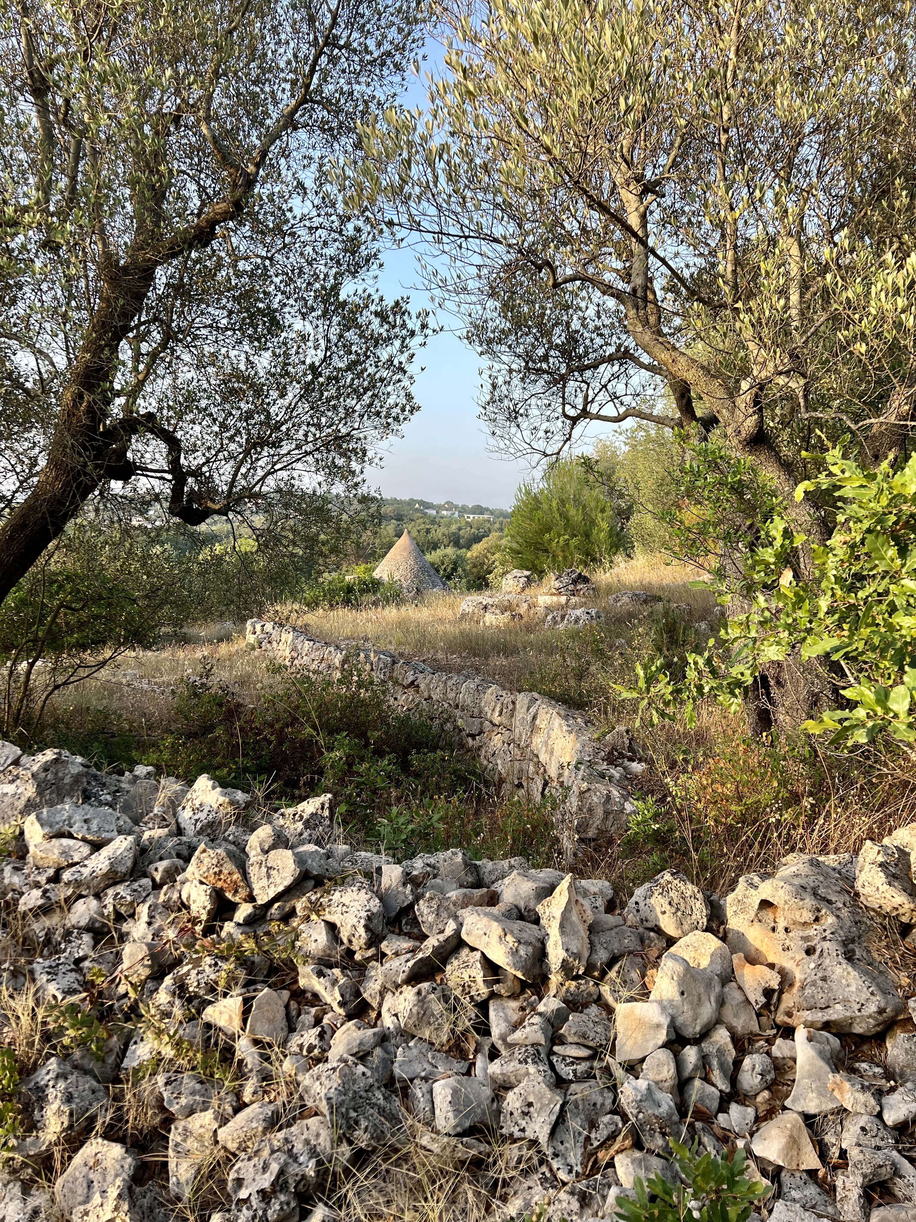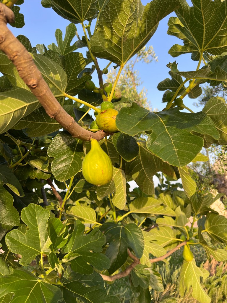 I woke up early again and went for a walk in the silent, still morning. It’s cool and quiet and there is no one but roosters and bees making any noise. The fields around the Villa seem so uninhabited, but as I walk through, there is a small Trulli here, and a little farm there, and a tiny vineyard someone must be tending. It is all so ancient and I keep wondering what it was like 100 years ago or 1000 years ago — probably not much different. I found dried olives on an very old stone wall under a tree, fig trees everywhere (we eat them every day), and desolate paths that all must lead to somewhere. It is enchanting.