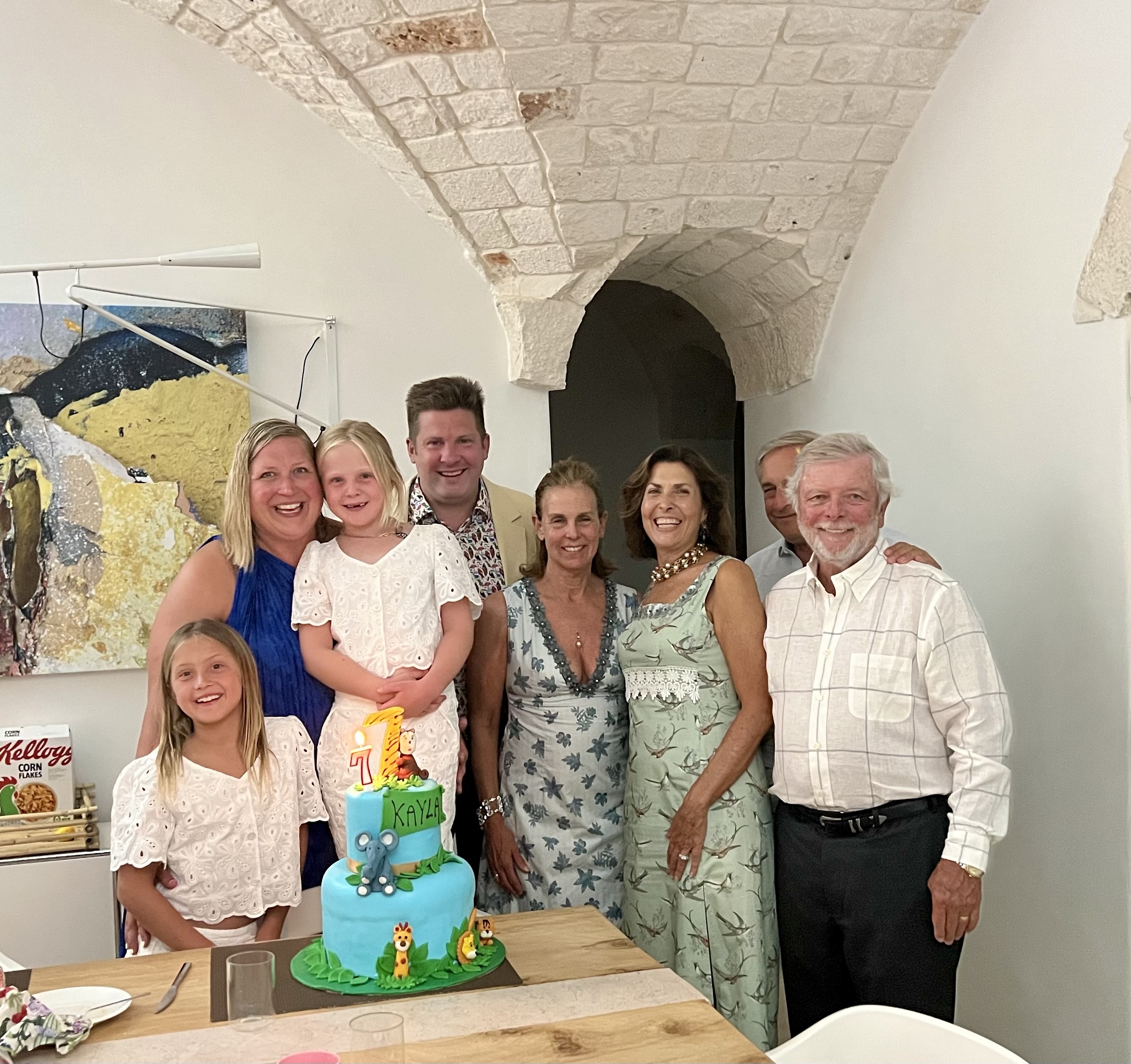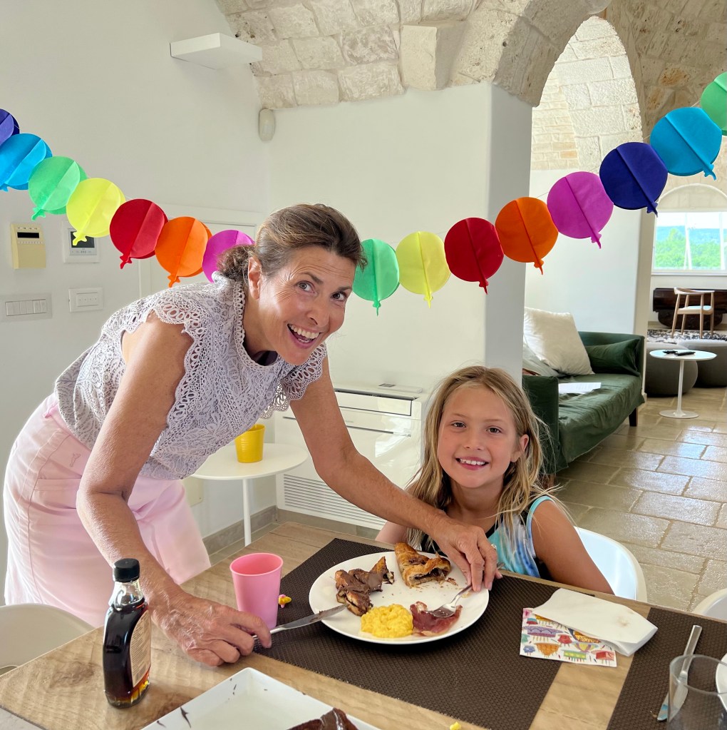 Today marks are youngest grandchild’s birthday, Kayla Marie Vacirca turned 7 in Italy! To mark this auspicious occasion, Auntie Cathy hung streamers and sister Addie helped Grammy make Nutella stuffed French Toast and Special scrambled eggs with Proscuitto.