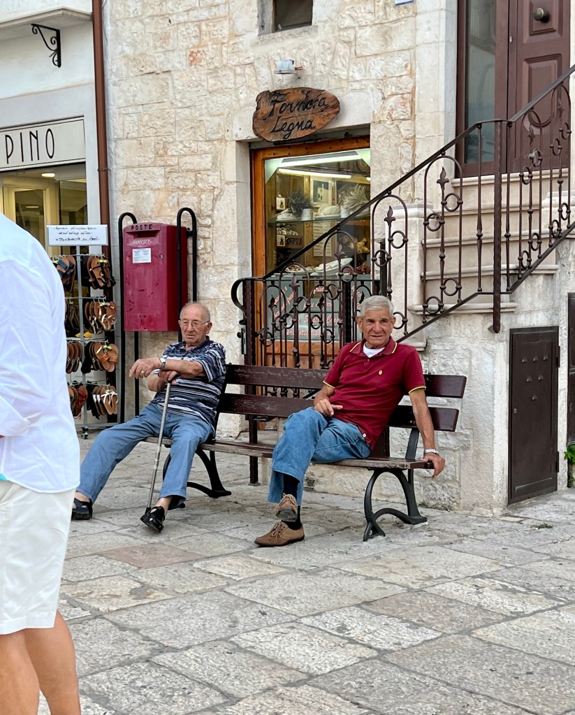 It’s not all glory here. As we drive back to Bari to pick up our suitcases (yay! — we picked up because courier could have taken 2 more days), we passed many areas that looked like communist block housing we saw in Romania. The south of Italy is poor, people live simply and their desires are modest by American standards. It’s different – not good, not bad, just different. Italy has a special feel, there is a grace to things, even the poorest areas have a softness to them. There’s a lilting presence in the people — men discussing the day, ladies doing the daily shopping, softly and with charm.