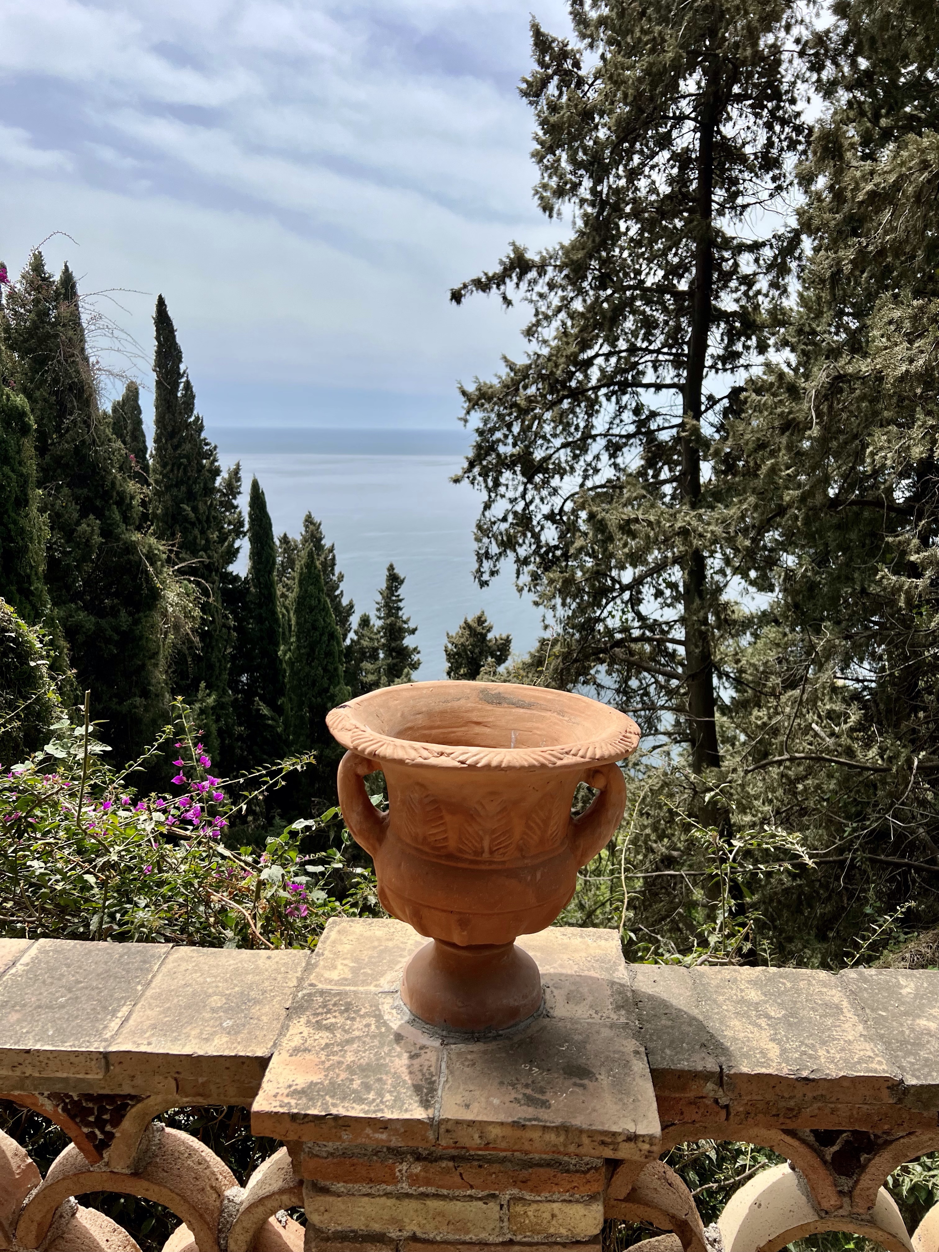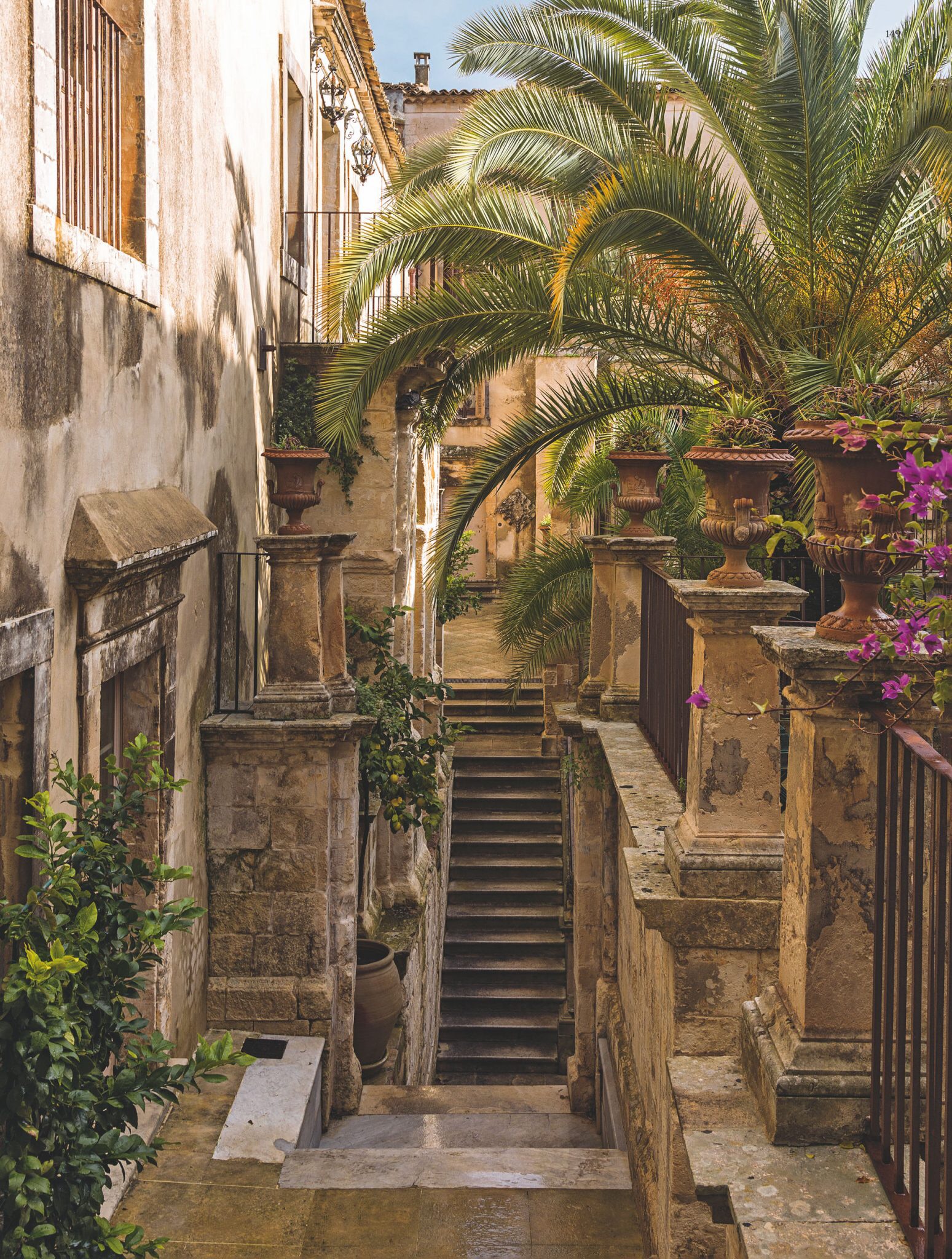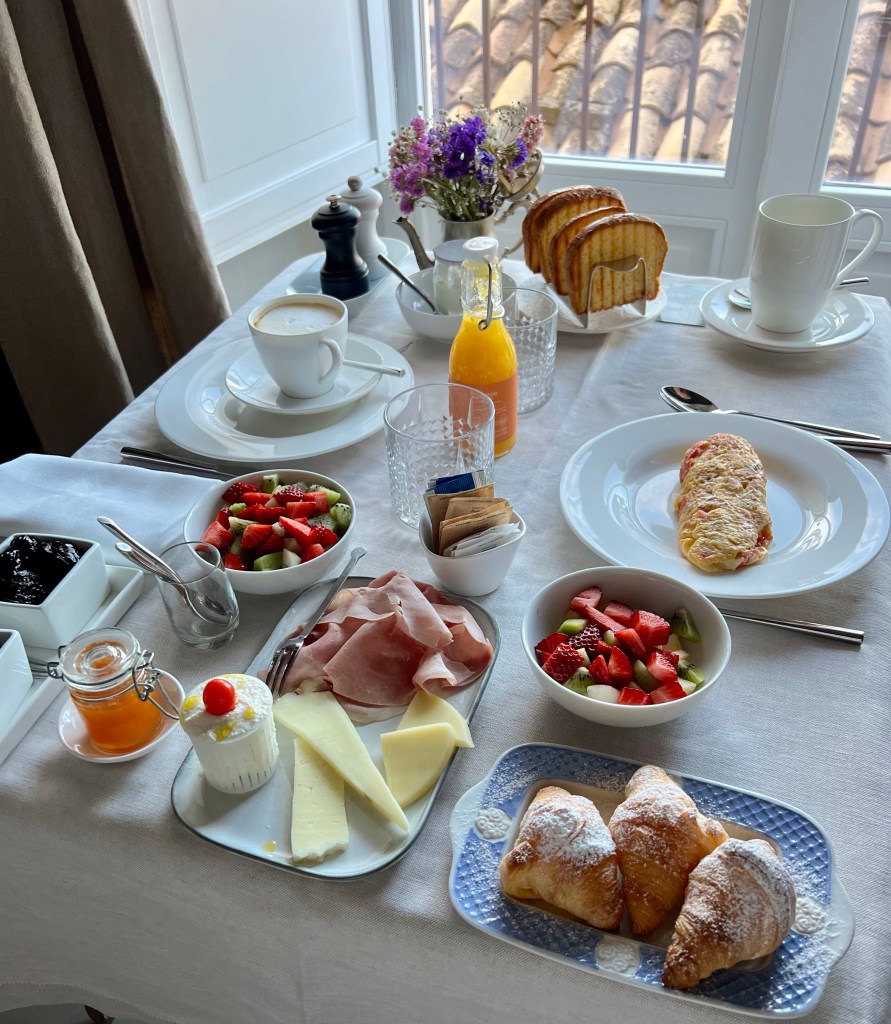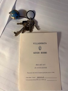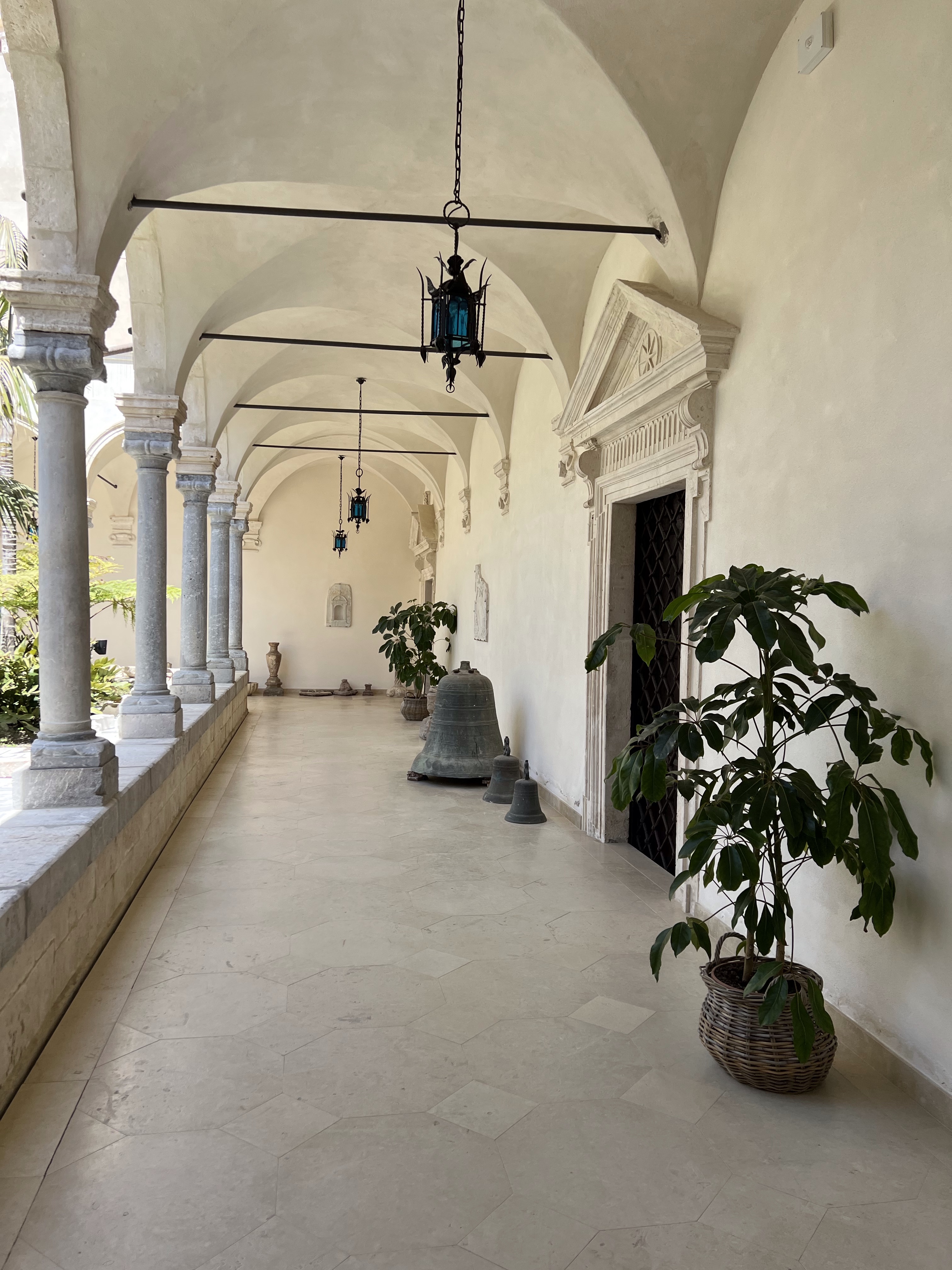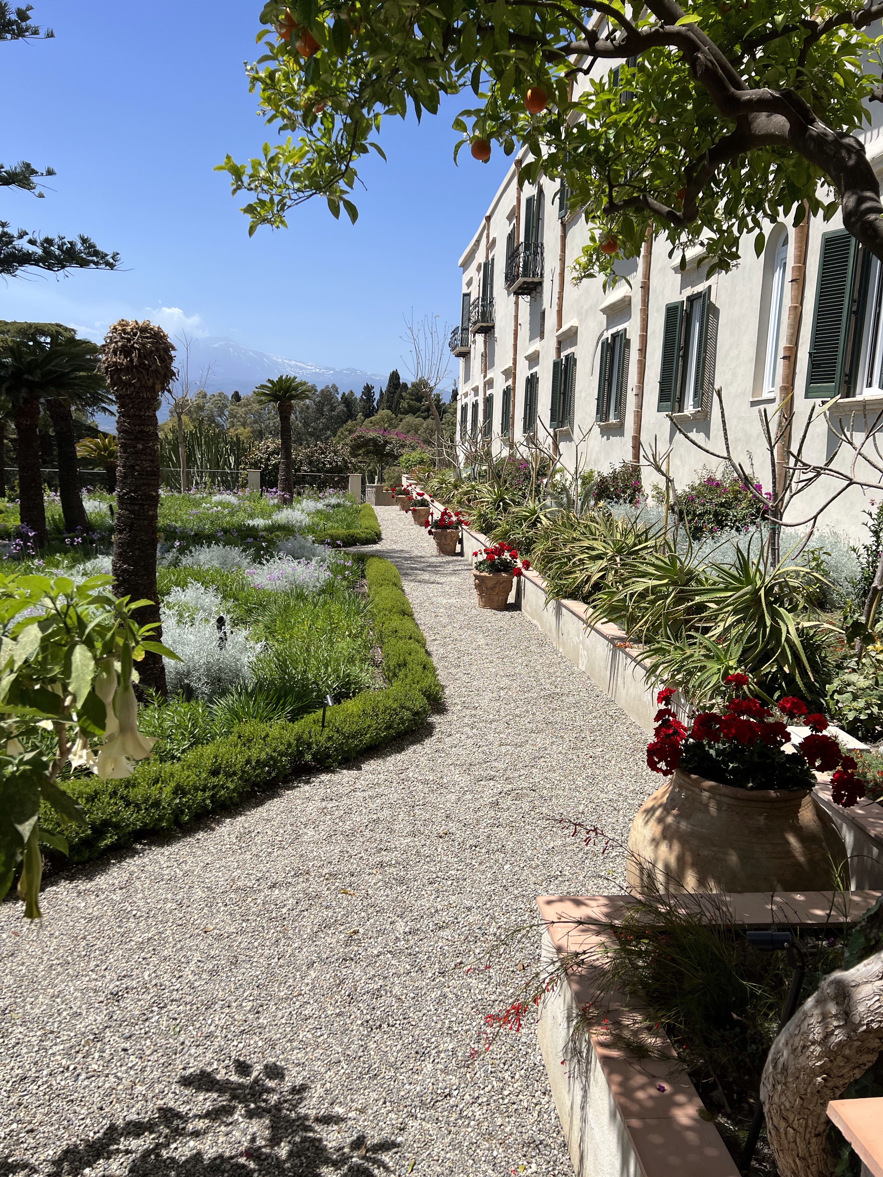 So here are some photos of the hotel. It doesn’t do it justice. There are cloisters for silent meditation, medieval staircases, a courtyard with dripping bougainvillea, and the staff in elegant Italian outfits, and gardens and vistas at every turn. Trees dripping with fruit, flowers in vibrant colors, and a softness to all of it.