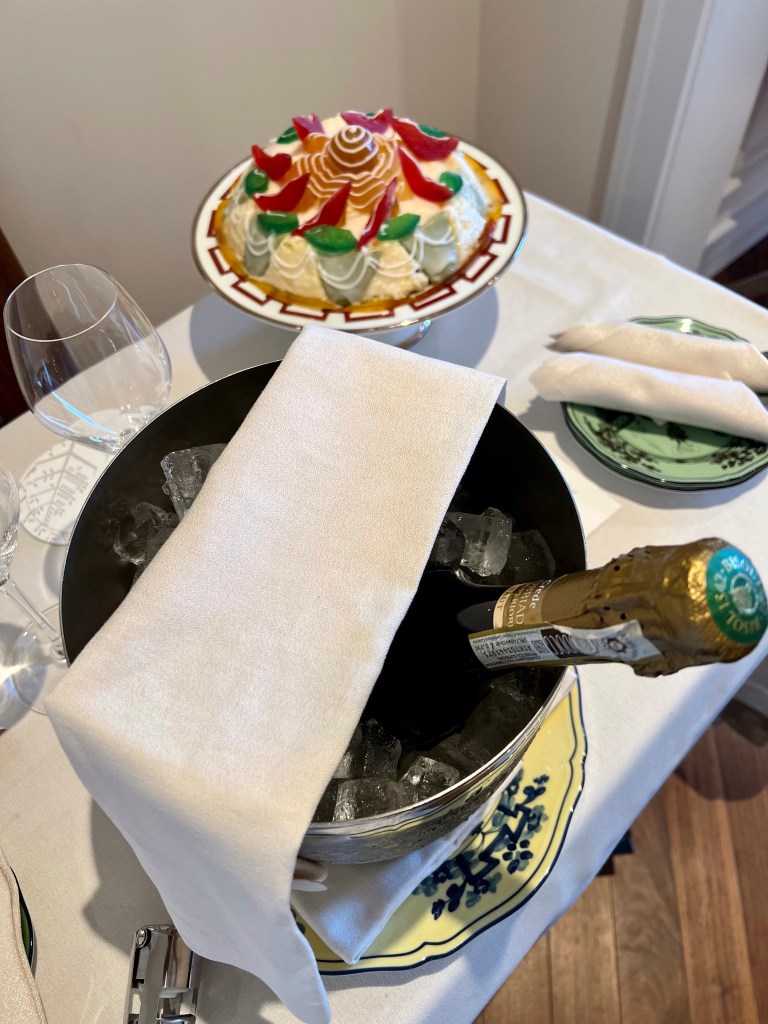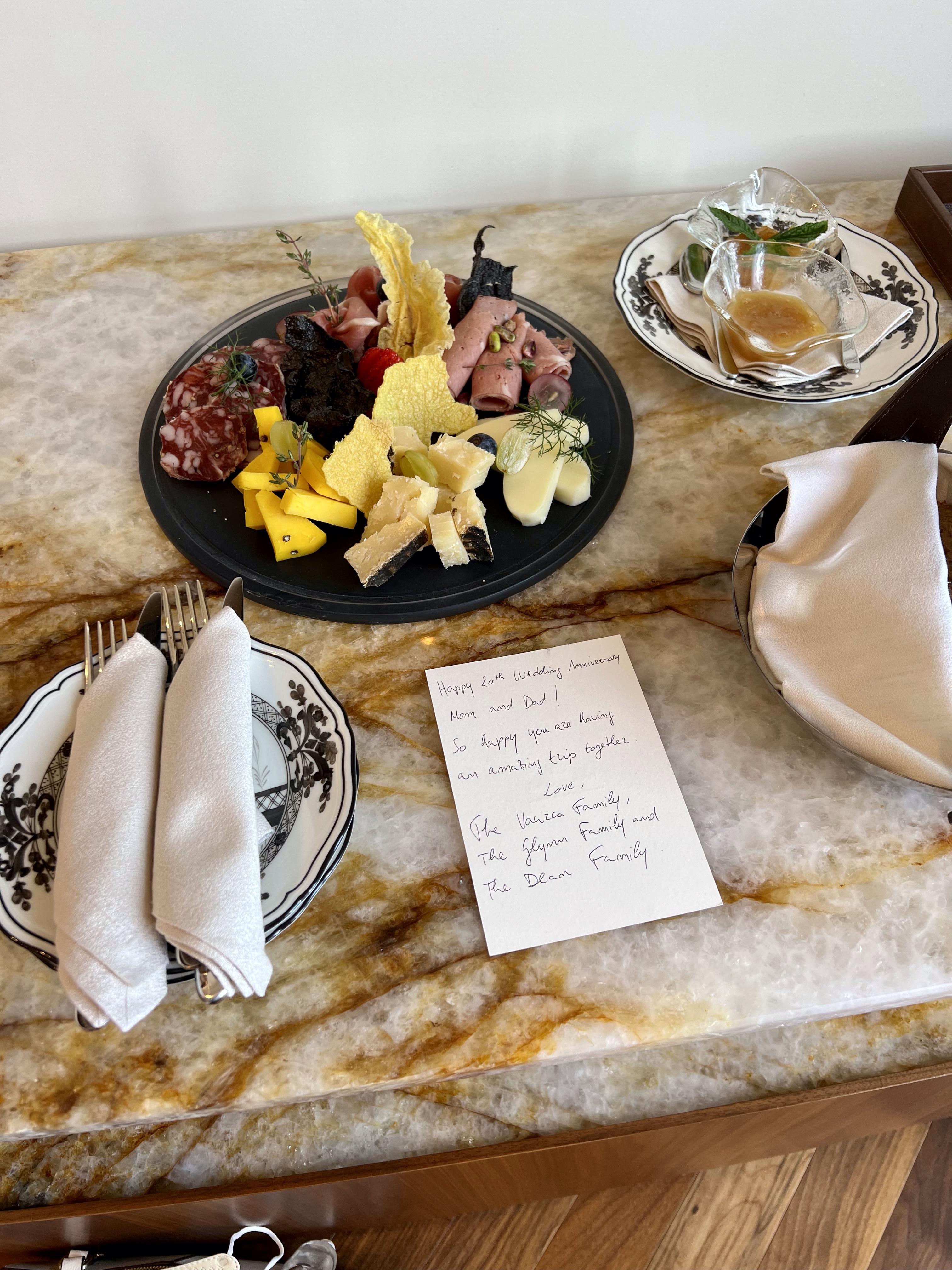 And now back in luxurious robes, drinking wine, eating our Italian wedding cake and preparing for our dinner tonight. A pretty marvelous 20th wedding anniversary.